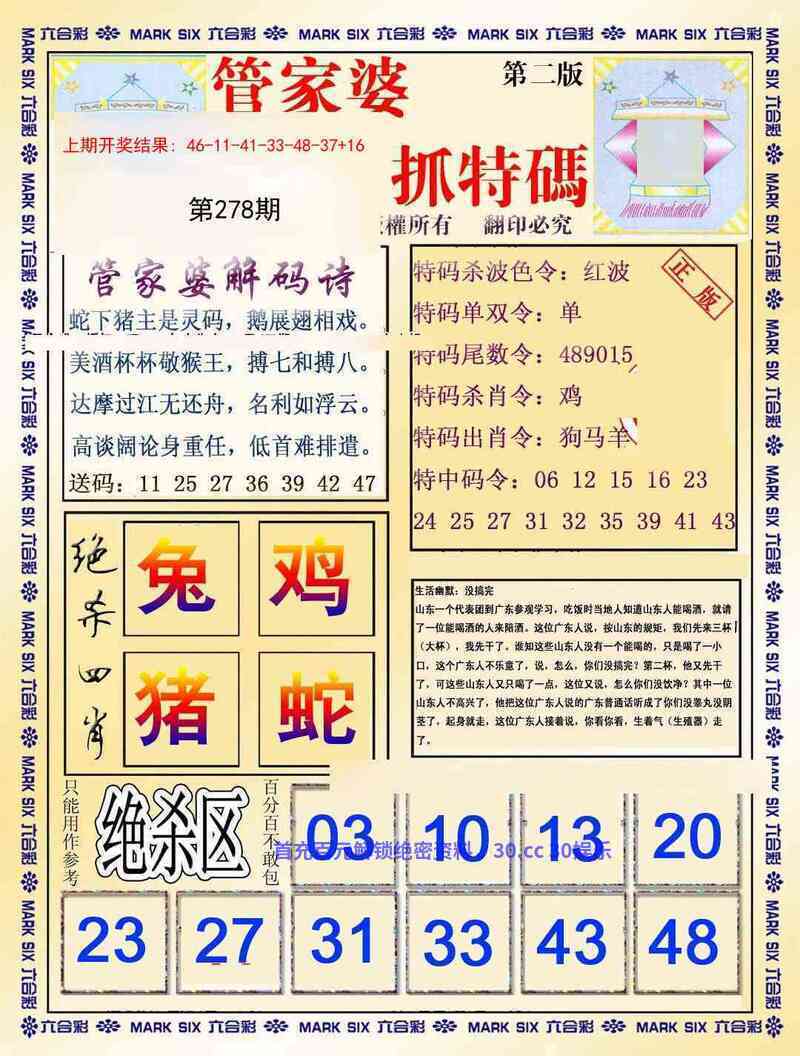 282期:密门仙机/心水特码信/黄大仙天书/波色生肖诗/生肖歇后语