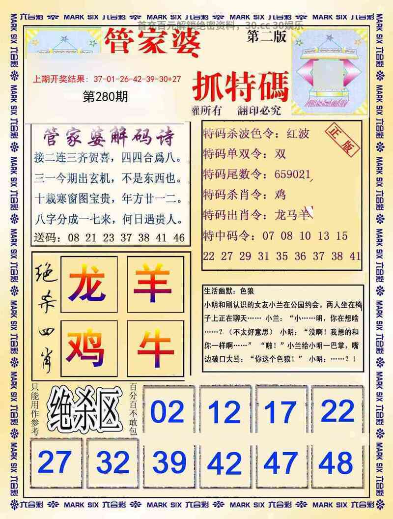 282期:特码暗语/曾道人救世心经/攻特料/六合心经/平码生肖点将